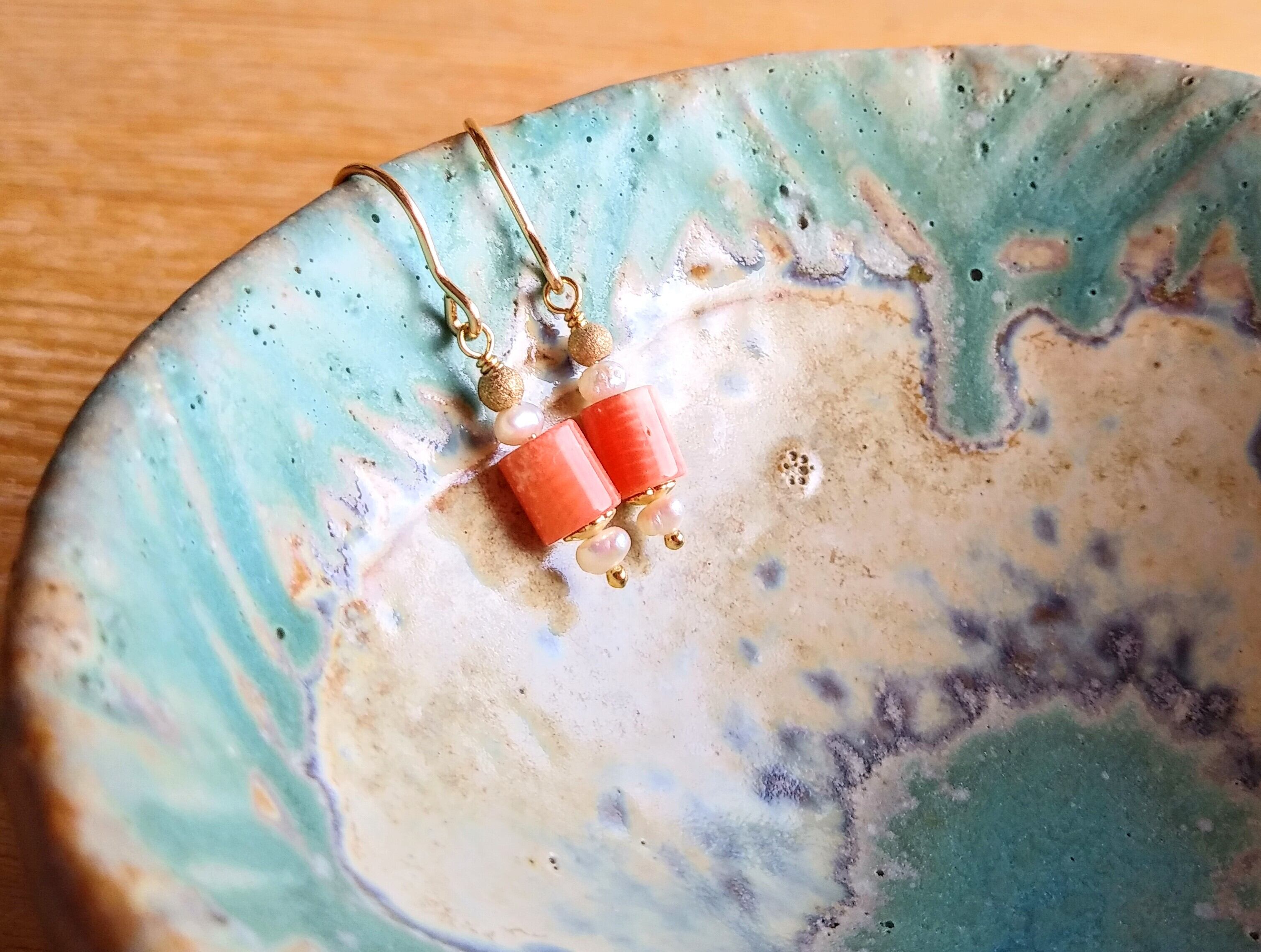 K14 GF ベビーパールとサーモンピンク染めサンゴのプチピアス