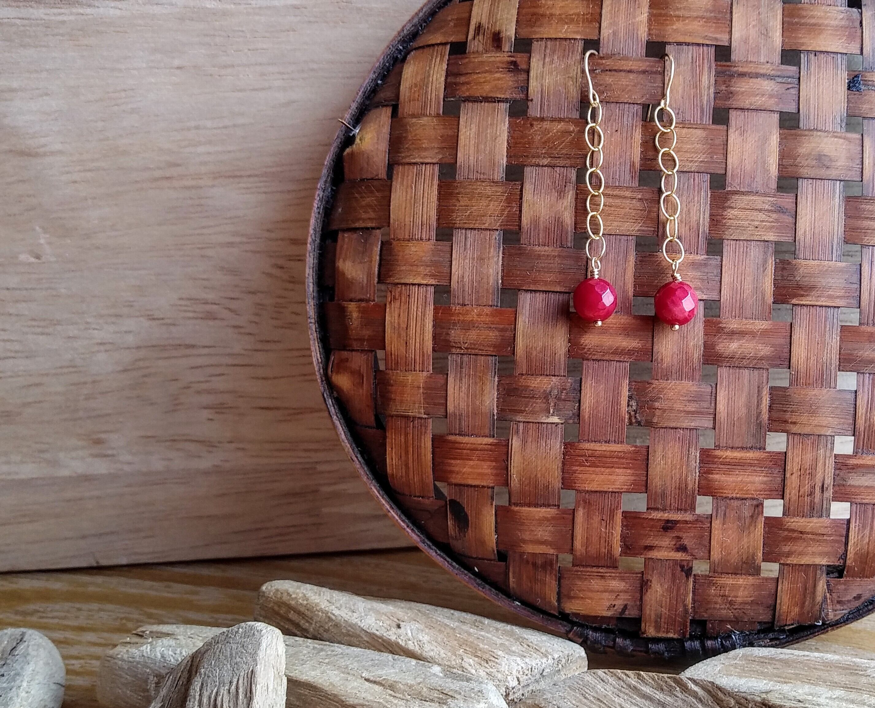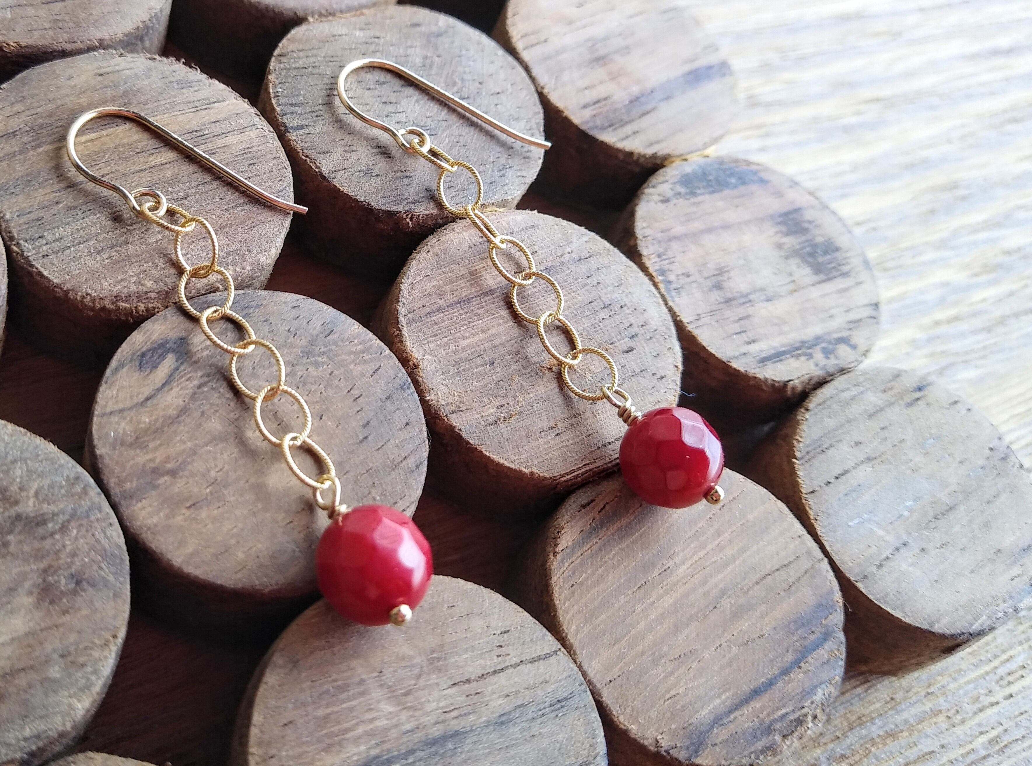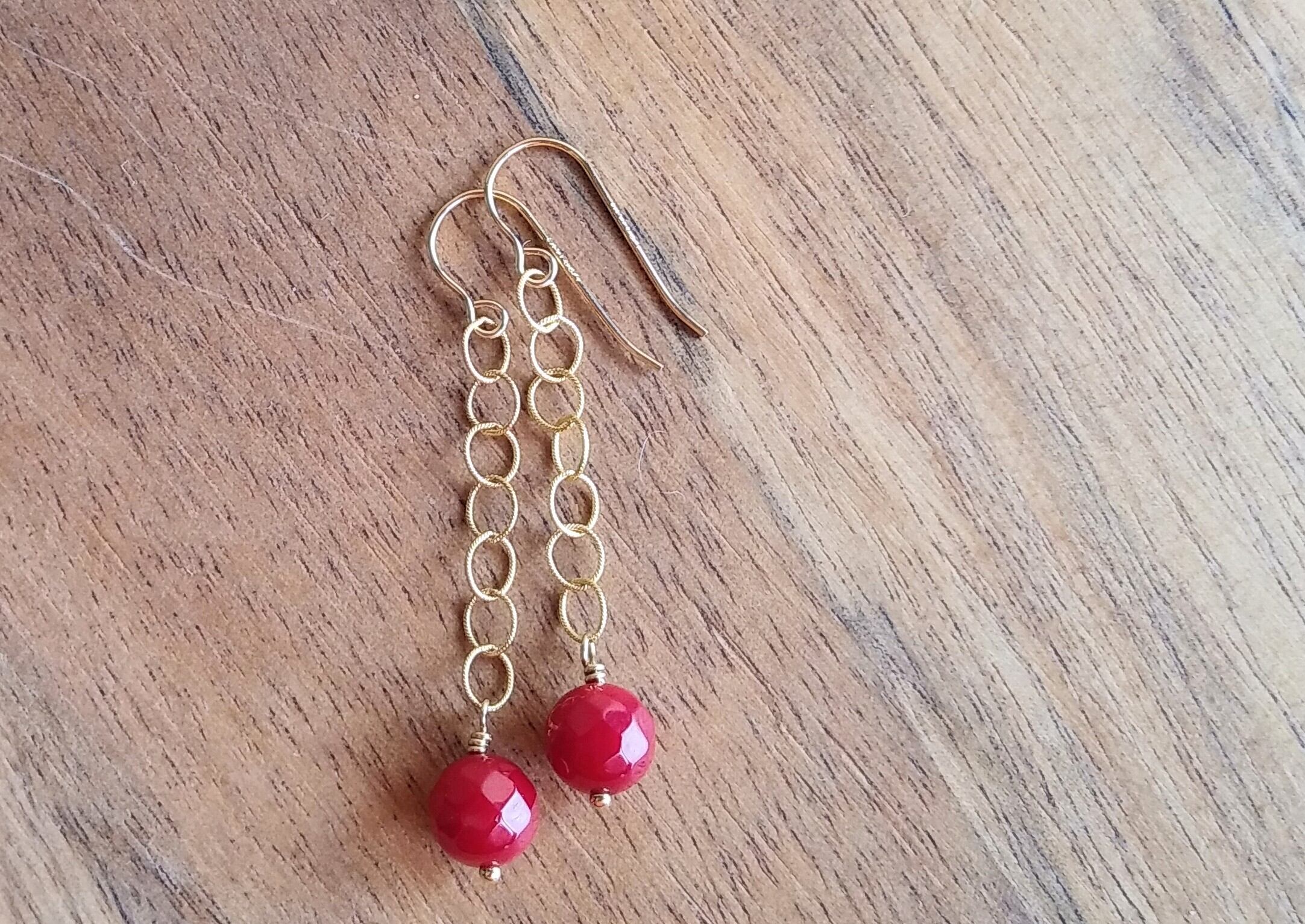 ウミタケサンゴを赤く染めて表面が輝くようにラウンドカットされたサンゴ玉のピアス。
